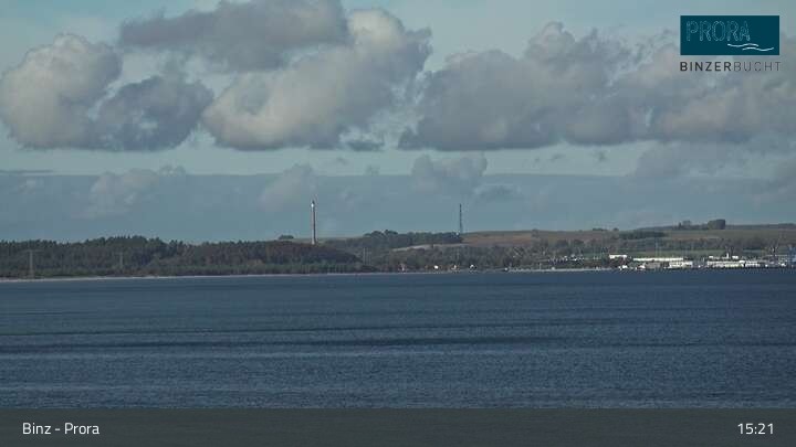 Die Kamera befindet sich auf der Insel Rügen am Strand von Prora und blickt über die Binzer Bucht.