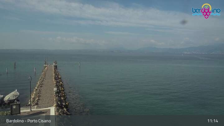 Die Kamera befindet sich am Strand Lido Mirabello und blickt nach Norden auf den Hafen von Bardolino am Gardasee.