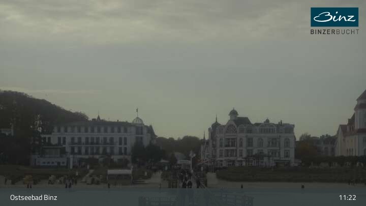 Zu sehen ist die Strandpromenade des Ostseebades Binz. Die Webcam ist auf der Seebrücke Binz positioniert und zeigt unter anderem Kurhaus, Strandpromenade und den Fischerstrand.