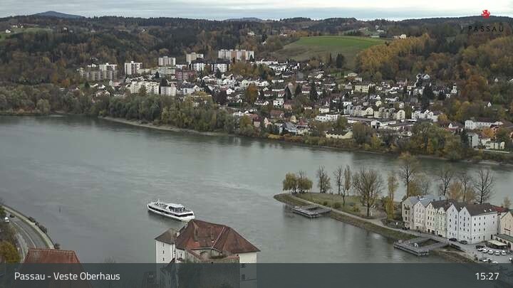 Die Webcam zeigt einen tollen Panoramablick von der Veste Oberhaus auf die Donau und die Altstadt von Passau. Neber der herrschaftlichen Burgfassade sieht man sehr gut die Landzunge zwischen Donau und Inn, auf der die Altstadt mit ihren denkmalgeschützten Häusern liegt. Gut zu erkennen sind unter anderem die Ortspitze am Zusammenfluss der drei Flüsse, das an der Donau liegende Rathaus, der weiße Dom St. Stephan und das erhöhte Kloster Mariahilf in der Innstadt.