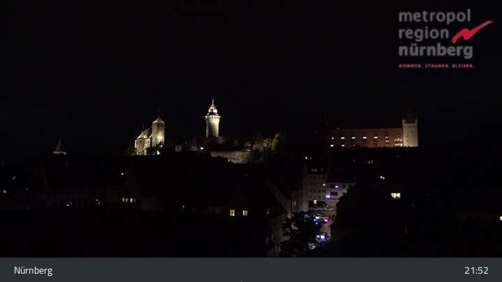 Blick über die Dächer Nürnbergs, die zweitgrößte Stadt Bayerns. Die Kamera ist in der Theresienstraße in der Altstadt positioniert und zeigt unter anderem die Kaiserburg, das Rathaus und das Staatstheater.