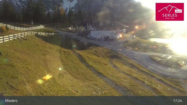 Die Webcam eröffnet den Blick von der Bergstation Koppeneck auf den Hausberg von Mieders, die Serles. Zu sehen sind außerdem das Bergrestaurant Koppeneck mit Kinderspielplatz und der Speichersee.