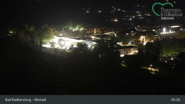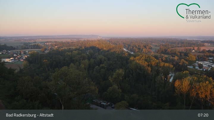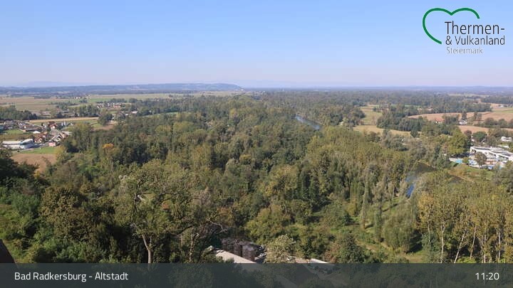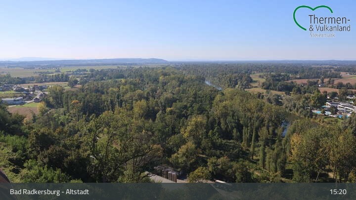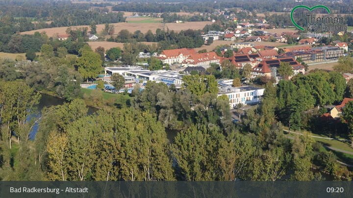Hier blickst du auf die historische Altstadt von Bad Radkersburg. Du kannst die Stadtpfarrkirche und die Frauenkirche erkennen. Davor befindet sich die Mur, die die Grenze zu Slowenien bildet.