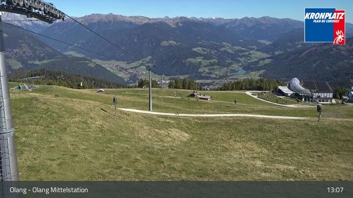 Hier siehst du die Mittelstation der Gondel Olang sowie die umliegende Bergwelt von Kronplatz.