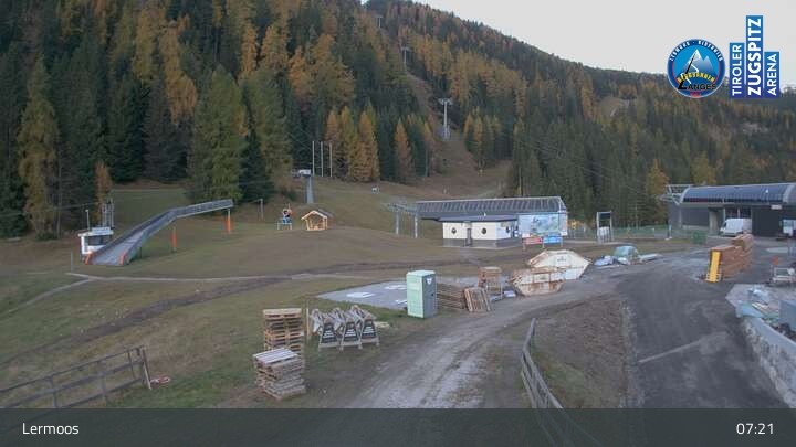 Die Webcam befindet sich an der Bergstation des Hochmoos Express in Lermoos und blickt auf die umliegenden Alpen.