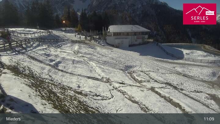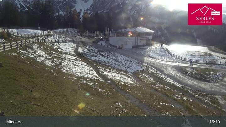 Die Webcam eröffnet den Blick von der Bergstation Koppeneck auf den Hausberg von Mieders, die Serles. Zu sehen sind außerdem das Bergrestaurant Koppeneck mit Kinderspielplatz und der Speichersee.