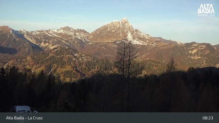 Blick von der Bergstation des La Crusc Sessellifts auf die Berge rund um Alta Badia. Die kleine Kirche ist ein beliebtes Wallfahrtsziel.