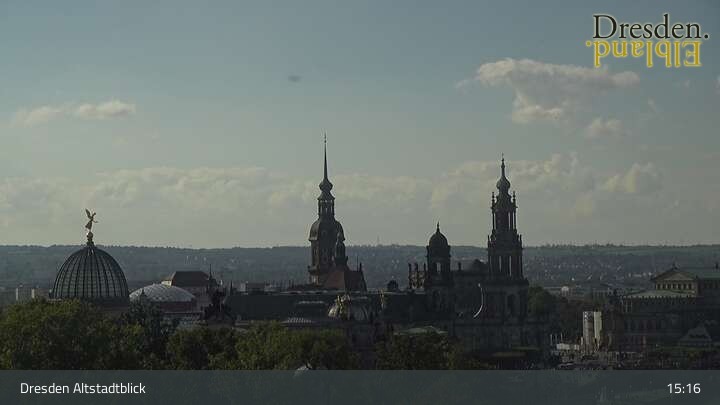 Die Kamera befindet sich am Hotel am Terrassenufer in Dresden und blickt auf die Altstadt und die Elbe.