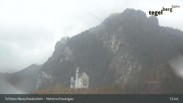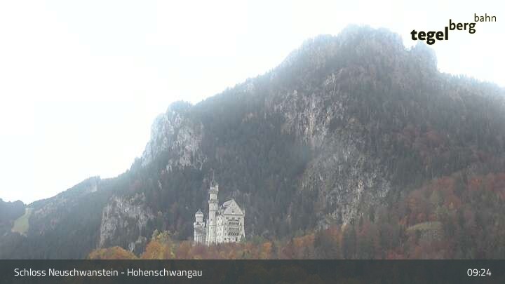 Die Kamera befindet sich am Schloss Hohenschwangau und schwenkt vom Schloss Neuschwanstein zum Museum der Bayerischen Könige.