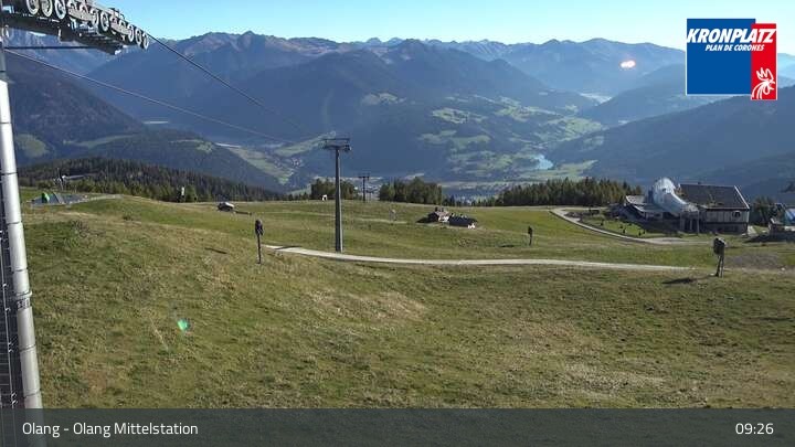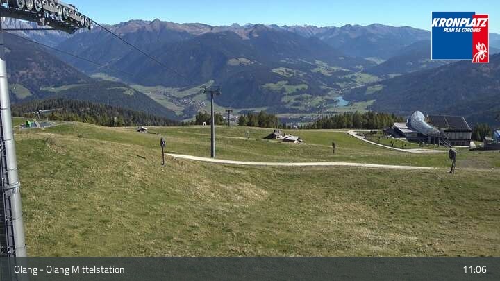Hier siehst du die Mittelstation der Gondel Olang sowie die umliegende Bergwelt von Kronplatz.