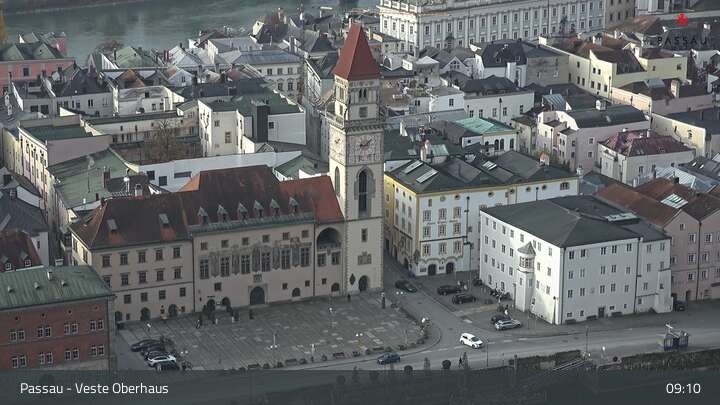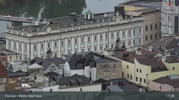 Die Webcam zeigt dir den Blick von der Veste Oberhaus über die Donau zur Altstadt der niederbayerischen Stadt Passau. Sehr gut zu erkennen sind links Teile der Burgveste, die Ortspitze wo die drei Flüsse Donau, Inn und Ilz zusammenfließen, die Hängebrücke über die Donau und rechts der weiße Stephansdom.