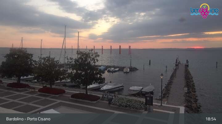 Die Kamera befindet sich am Strand Lido Mirabello und blickt nach Norden auf den Hafen von Bardolino am Gardasee.
