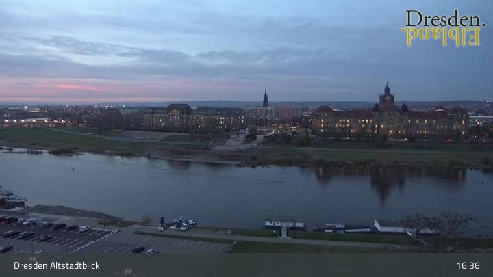 Die Kamera befindet sich am Hotel am Terrassenufer in Dresden und blickt auf die Altstadt und die Elbe.