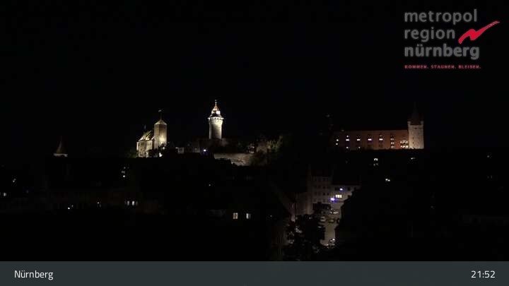 Blick über die Dächer Nürnbergs, die zweitgrößte Stadt Bayerns. Die Kamera ist in der Theresienstraße in der Altstadt positioniert und zeigt unter anderem die Kaiserburg, das Rathaus und das Staatstheater.