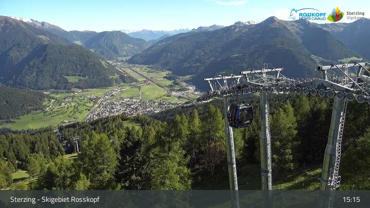 Die Kamera steht an der Bergstation der Seilbahn am Rosskopf und zeigt die Stubaier Alpen.