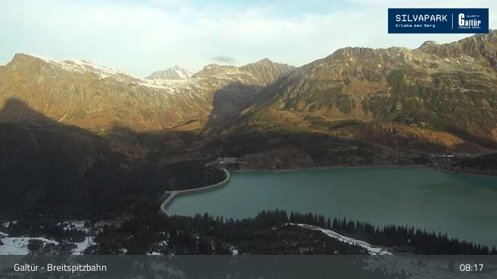 Die Webcam an der Breitspitzbahn in Galtür blickt auf die umliegende Bergwelt.