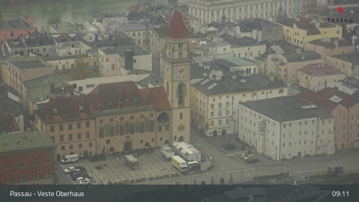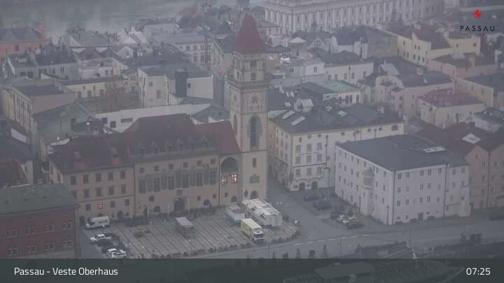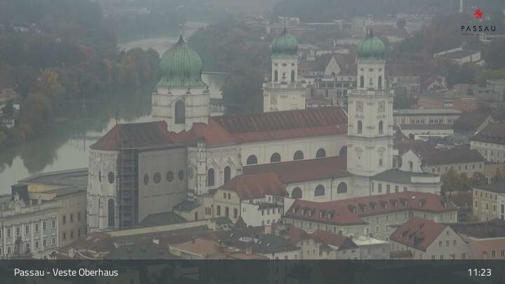 Die Webcam zeigt dir den Blick von der Veste Oberhaus über die Donau zur Altstadt der niederbayerischen Stadt Passau. Sehr gut zu erkennen sind links Teile der Burgveste, die Ortspitze wo die drei Flüsse Donau, Inn und Ilz zusammenfließen, die Hängebrücke über die Donau und rechts der weiße Stephansdom.
