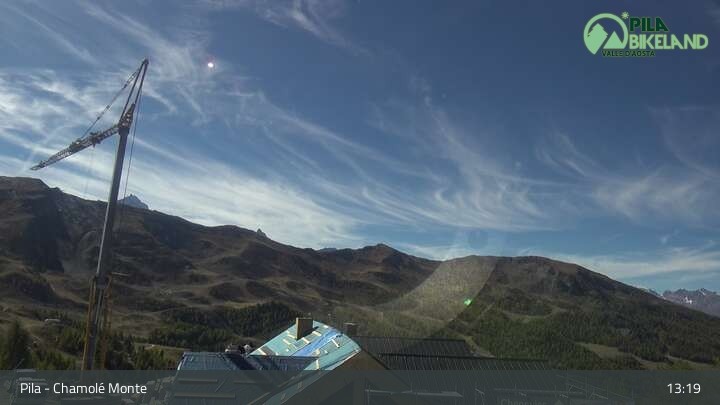 Die Webcam befindet sich an der Bergstation des Chamolé Sessellifts und blickt über die Berge des Aostatals.