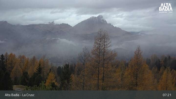 Blick von der Bergstation des La Crusc Sessellifts auf die Berge rund um Alta Badia. Die kleine Kirche ist ein beliebtes Wallfahrtsziel.