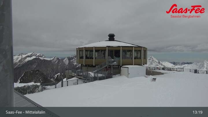 Diese Webcam auf dem Mittelallalin, einem Nebengipfel des Allalinhorns in Saas-Fee zeigt das Drehrestaurant, von dem aus man die Aussicht auf die umliegenden Walliser Alpen genießen kann.
