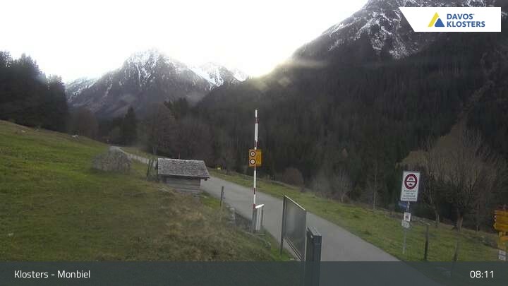 Die Webcam blickt vom Parkplatz in Monbiel bei Klosters auf die umliegende schweizer Bergwelt. Hier liegen unter anderem viele schöne Wanderwege.