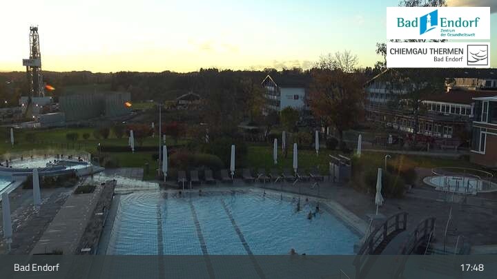 Die Webcam bietet einen Blick das Außengelände der Chiemgau Therme in Bad Endorf. Zu sehen ist unter anderem auch der 125 Meter lange Strömungskanal, ein Highlight der Therme im Landkreis Rosenheim.