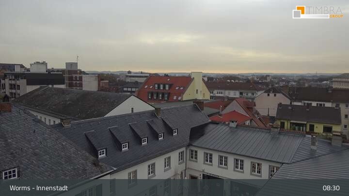 Die Webcam befindet sich in der Wormser Innenstadt. Der Blick wandert von der Magnuskirche, hinter welcher die Türme des Wormser Doms St. Peter zu sehen ist über die Dächer der Stadt bis zum Andreasstift und der Stadtmauer.