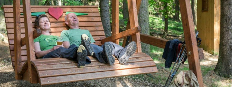 Gemütlich geht es dann weiter zum Ende des Baumkronenweges auf Waldpfaden und vorbei an einer hölzernen Klangorgel, dem Barfußweg, vielen weiteren Schautafeln und Gleichgewichtsstationen. Entlang der letzten 100 Meter befindet sich auch der Yolatesweg. Schautafeln erklären ausführlich Yoga-Übungen, die der interessierte Besucher an Ort und Stelle durchführen kann.