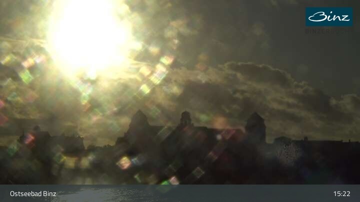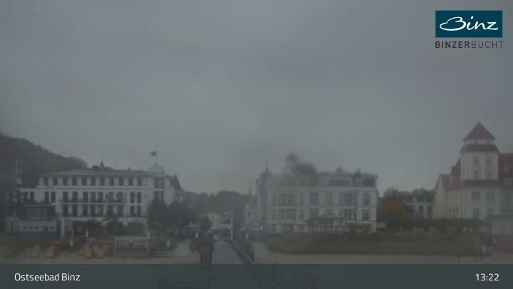 Zu sehen ist die Strandpromenade des Ostseebades Binz. Die Webcam ist auf der Seebrücke Binz positioniert und zeigt unter anderem Kurhaus, Strandpromenade und den Fischerstrand.