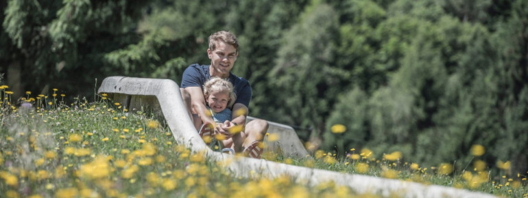 Doch auch an der Talstation der Sommerrodelbahn gibt es einiges zu entdecken. Hier befindet sich der sogenannte Simon Kiddy Park, der einen 120 Meter langen Fahrrad-Rundparcour für Kinder bietet. Dort fahren die kleinen Radkünstler über Hindernisse wie Wellen oder Holzbrücken. Vor Ort können Kinderfahrräder sowie Laufräder für die Kleinsten ausgeliehen werden. Solltest du nach einer Fahrt mit der Sommerrodelbahn Biberg jedoch noch mehr Energie haben, kannst du eine Wanderung anschließen. Durch die Almwiesen führen viele Wanderwege und Rundtouren, sodass sich das Gebiet perfekt für einen Tagesausflug lohnt.