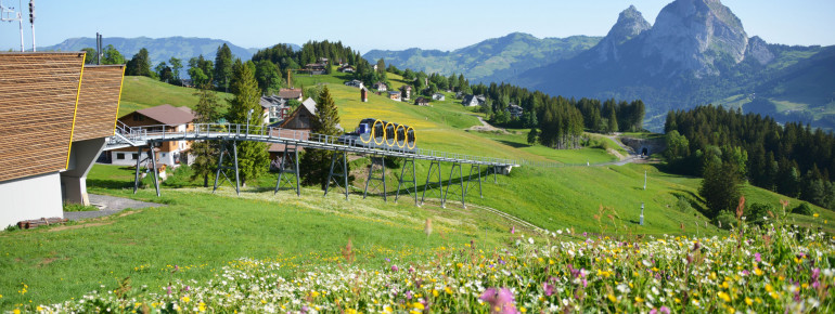 Mehr als 80 Jahre lang sorgte die alte Drahtseilbahn Schwyz-Stoos für den Transport auf das Stooser Hochplateau am Fuße des Fronalpstocks in der Zentralschweiz. Jetzt wurde sie durch die neue Standseilbahn ersetzt. Fünf Jahre dauerten die Bauarbeiten. Für die Realisierung dieser Weltneuheit mussten drei Tunnel und zwei Brücken gebaut werden. Die beiden Wagen mit jeweils vier Kabinen können 1.500 Passagiere pro Stunde befördern.
