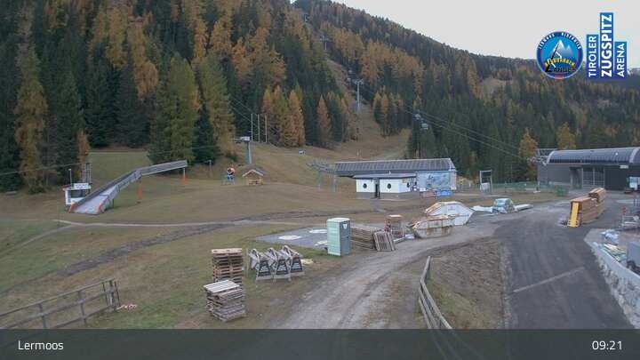 Die Webcam befindet sich an der Bergstation des Hochmoos Express in Lermoos und blickt auf die umliegenden Alpen.