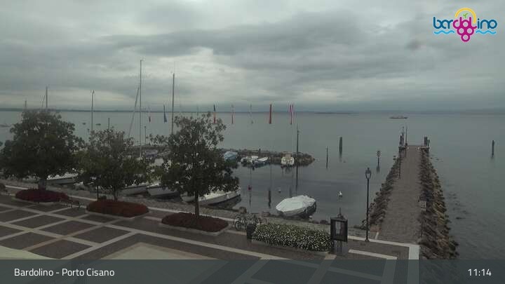 Die Kamera befindet sich am Strand Lido Mirabello und blickt nach Norden auf den Hafen von Bardolino am Gardasee.