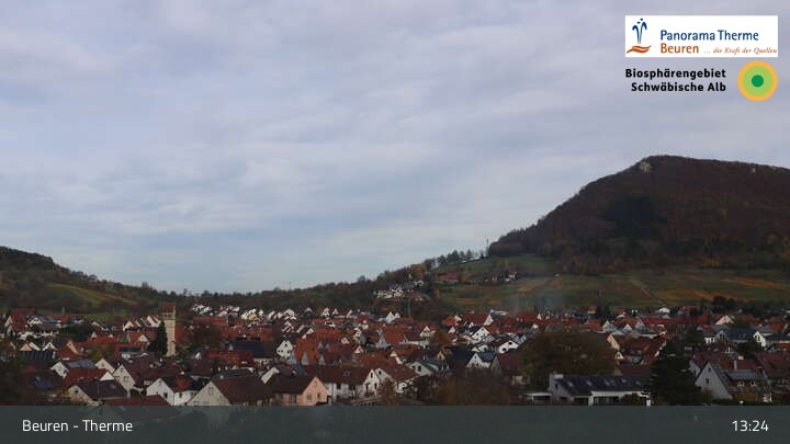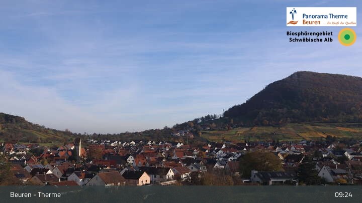 Blick über Beuren in der Schwäbischen Alb. Die Webcam befindet sich in der Panorama Therme Beuren.
