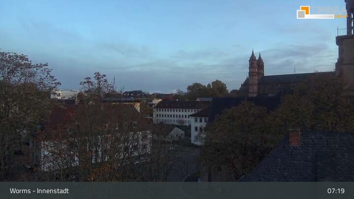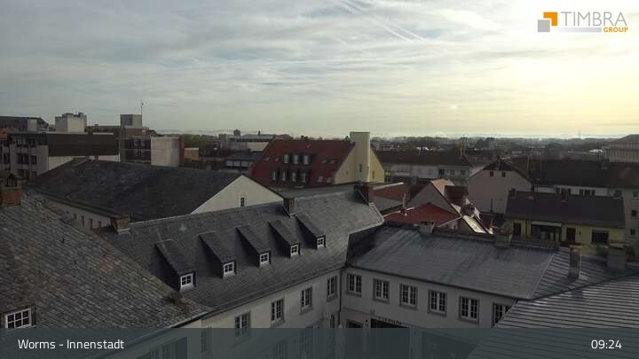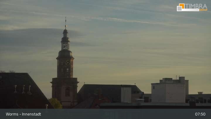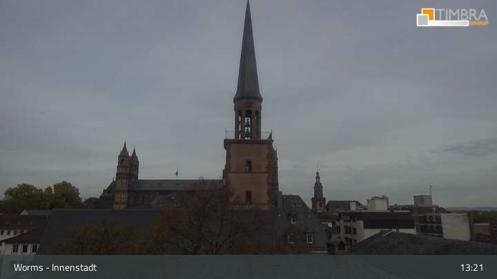 Die Webcam befindet sich in der Wormser Innenstadt. Der Blick wandert von der Magnuskirche, hinter welcher die Türme des Wormser Doms St. Peter zu sehen ist über die Dächer der Stadt bis zum Andreasstift und der Stadtmauer.