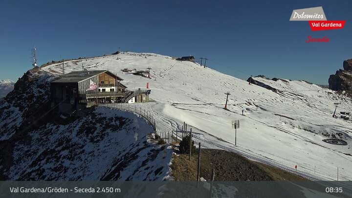 Von der Seceda eröffnet sich der Blick nach Süden zur Sellagruppe und dem Langkofel