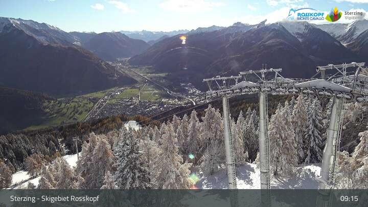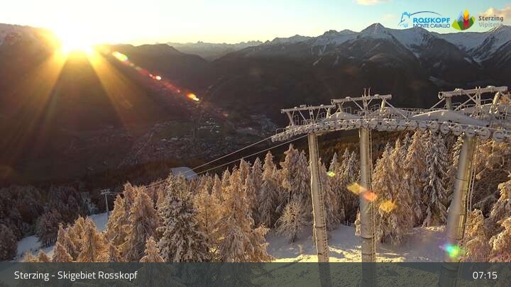 Die Kamera steht an der Bergstation der Seilbahn am Rosskopf und zeigt die Stubaier Alpen.