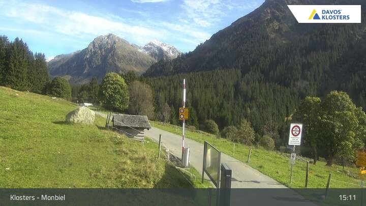 Die Webcam blickt vom Parkplatz in Monbiel bei Klosters auf die umliegende schweizer Bergwelt. Hier liegen unter anderem viele schöne Wanderwege.