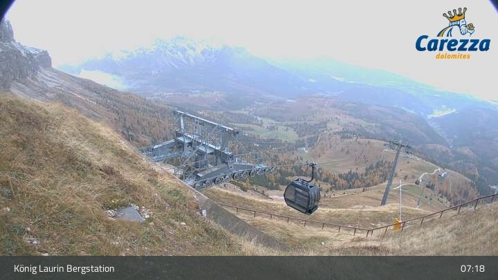 Die Webcam eröffnet von der Kölner Hütte das Panorama zum Latemar. Du siehst hier auch gut die neue König Laurin Gondelbahn mit unterirdischer Bergstation.