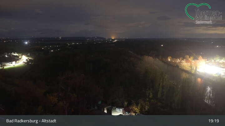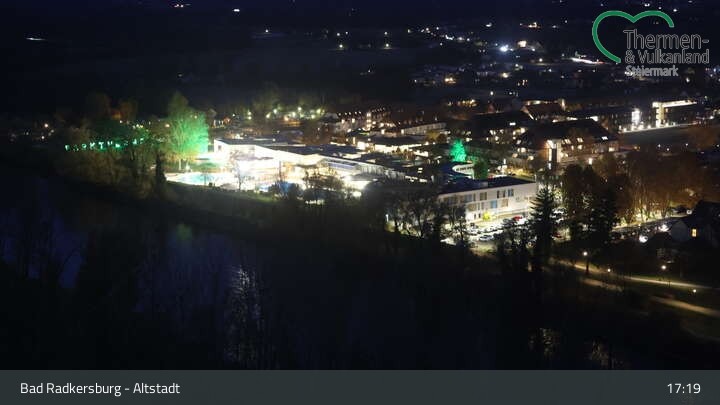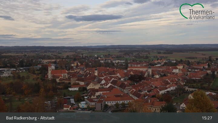 Hier blickst du auf die historische Altstadt von Bad Radkersburg. Du kannst die Stadtpfarrkirche und die Frauenkirche erkennen. Davor befindet sich die Mur, die die Grenze zu Slowenien bildet.